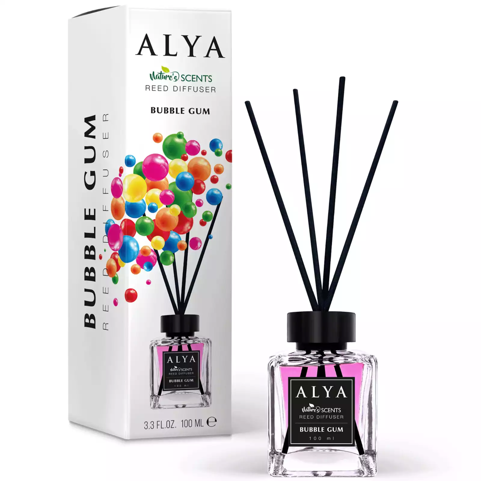 Alya „Kramtomoji Guma“ difuzorius – saldus, žaismingas kvapas jūsų namams. 100 ml talpa, ilgalaikis aromatas su mediniais pagaliukais.