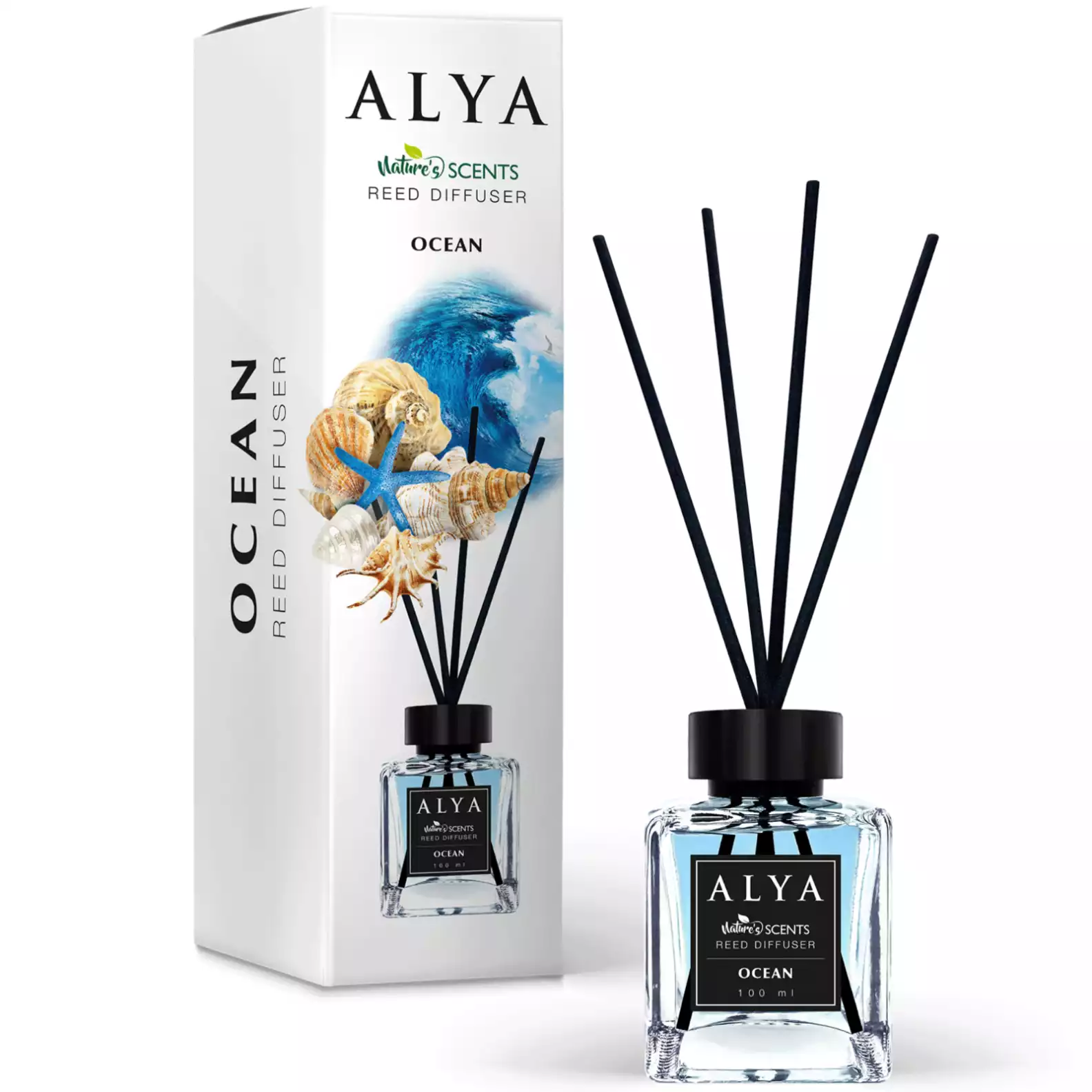Alya „Ocean“ difuzorius – gaivus jūros aromatas jūsų namams. 100 ml talpa, ilgalaikis kvapo sklidimas su mediniais pagaliukais.