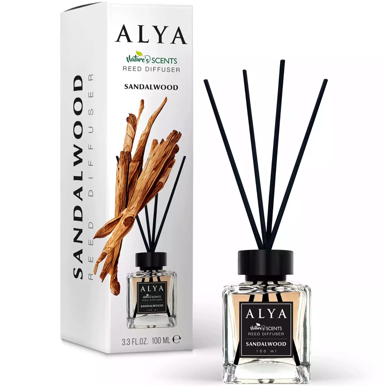 Alya „Sandalmedis“ difuzorius – šiltas, prabangus kvapas jūsų namams. 100 ml talpa, ilgalaikis aromatas su mediniais pagaliukai