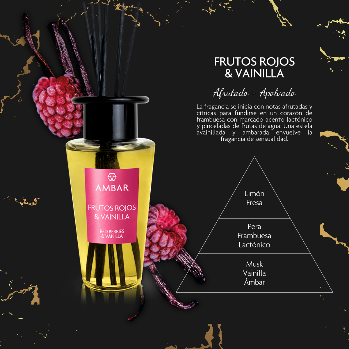 „Frutos Rojos & Vainilla” – saldus, vaisinis, šiek tiek gurmaniškas. Puikiai tinka norint sukurti jaukią, šiltą ir kvapnią namų aplinką.