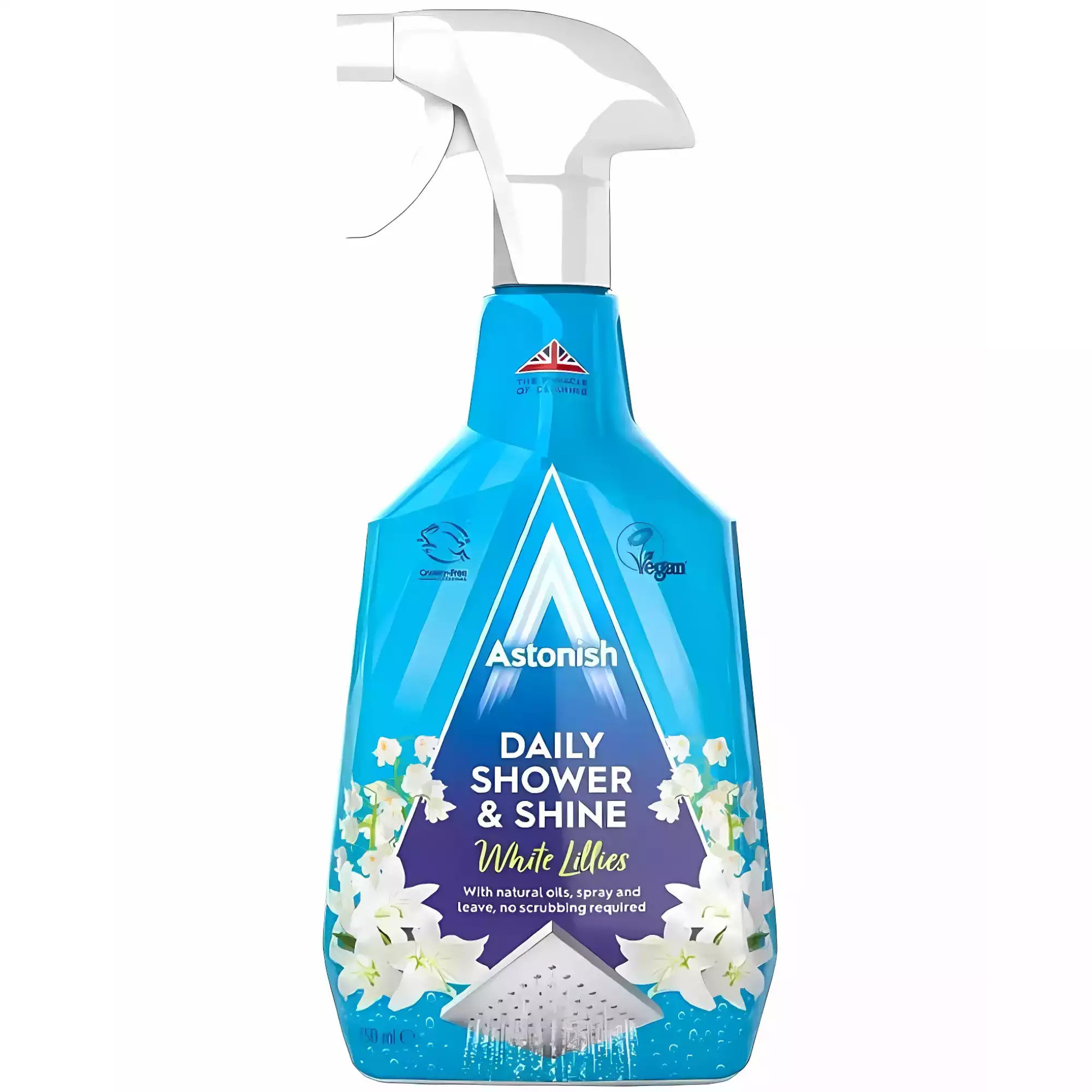 Astonish Daily Shower & Shine White Lilies (750 ml) – kasdienė dušo priežiūros priemonė, kuri padeda išvengti vandens dėmių ir kalkių nuosėdų susidarymo. Naudojant reguliariai, paviršiai išlieka švarūs, skaidrūs ir spindintys be intensyvaus šveitimo.