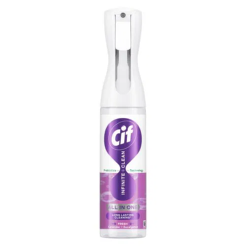 Cif Infinite + Clean „Levanda & Eukaliptas“ – universalus paviršių valiklis su probiotikų technologija, užtikrinantis ilgalaikę švarą ir gaivą. Švelnus levandų ir gaivus eukalipto aromatas suteikia malonų pojūtį, o pažangi formulė veikia net iki 3 dienų po naudojimo. Tinka valyti virtuvės, vonios ir kitų kambarių paviršius, įskaitant stalviršius, plyteles, veidrodžius bei net minkštus audinius. Eterinių aliejų pagrindu sukurtas valiklis yra draugiškas vaikams ir augintiniams, nepalieka dryžių ir užtikrina nepriekaištingą švarą.