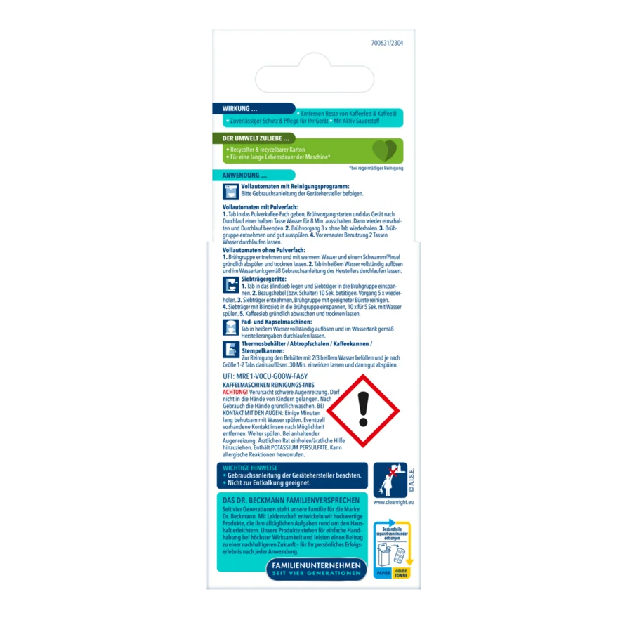 Dr. Beckmann valymo tabletės kavos aparatams – tai patikimas pasirinkimas norint užtikrinti švarą ir ilgesnį įrenginio tarnavimo laiką. Tabletės efektyviai pašalina kavos likučius, riebalus ir kitus nešvarumus, kurie kaupiasi naudojimo metu.