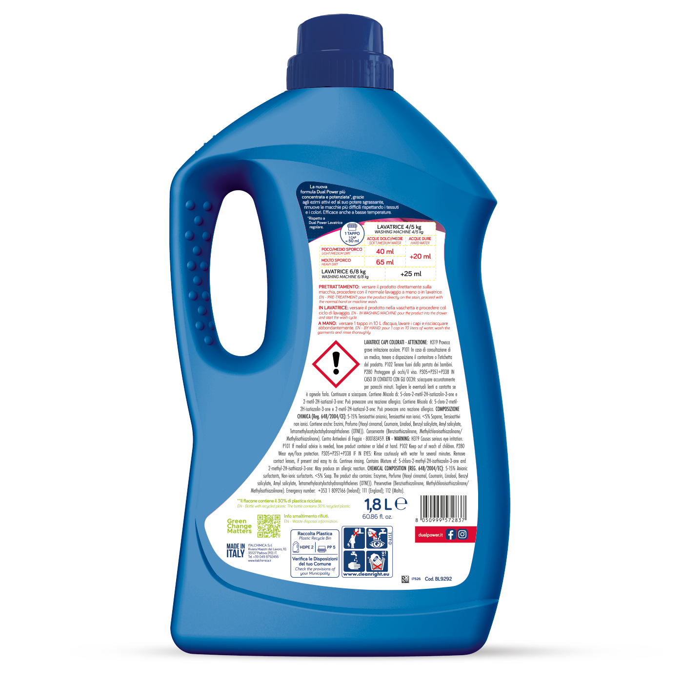 Dual Power „Colour“ skystas skalbiklis – profesionalus pasirinkimas spalvotiems audiniams. Jo pažangi formulė giliai įsiskverbia į audinius, pašalina net įsisenėjusias dėmes, neutralizuoja nemalonius kvapus ir padeda ilgiau išlaikyti spalvų ryškumą. Šis skalbiklis efektyviai veikia tiek skalbiant rankomis, tiek skalbimo mašinoje, užtikrindamas nepriekaištingą švarą net žemoje temperatūroje. 1,8 l buteliuko pakanka iki 40 skalbimų, todėl produktas yra ir ekonomiškas, ir patogus. Puikus pasirinkimas kasdieniam naudojimui – švarūs, gaiviai kvepiantys ir ryškius atspalvius išsaugantys drabužiai po kiekvieno skalbimo.