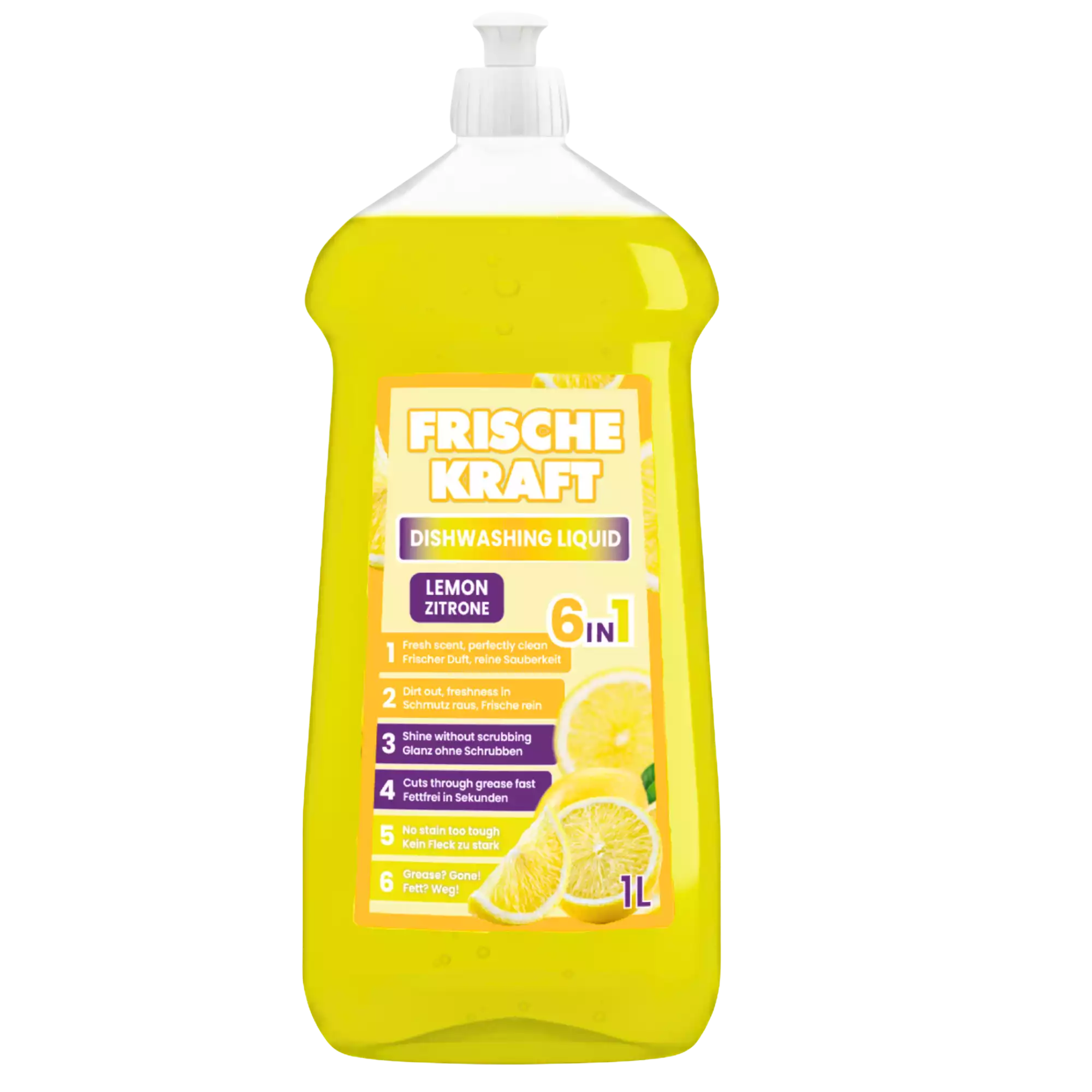 „Frische Kraft 6in1“ citrinų kvapo indų ploviklis – tai koncentruotas, kasdieniam naudojimui sukurtas ploviklis, padedantis lengvai pašalinti riebalus, maisto likučius ir sunkiau įveikiamus nešvarumus. 6-in-1 formulė užtikrina efektyvų riebalų skaidymą. Gaivų kvapą, švelnų putojimą, malonų slydimą plaunant ir higienišką indų švarą be papildomo šveitimo.