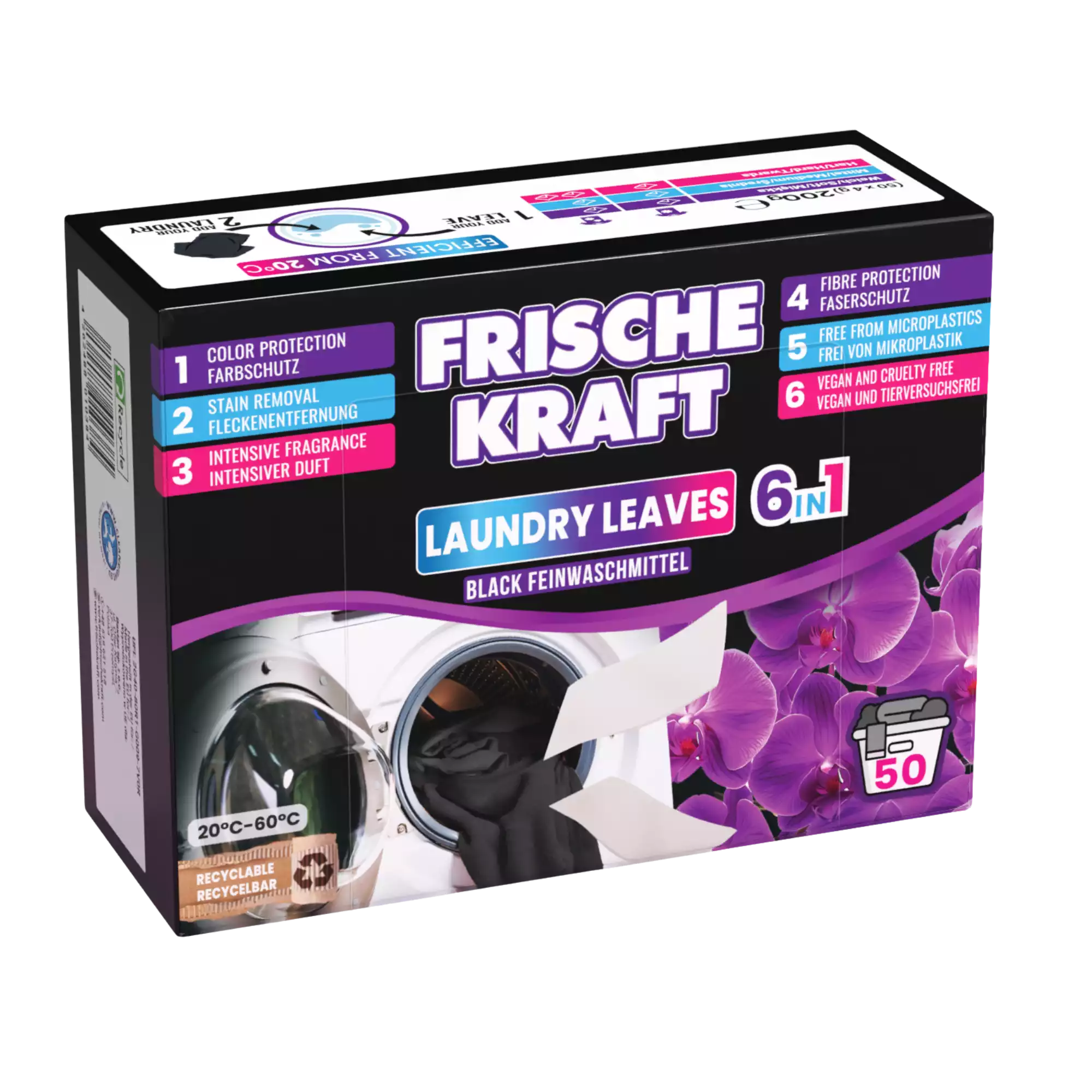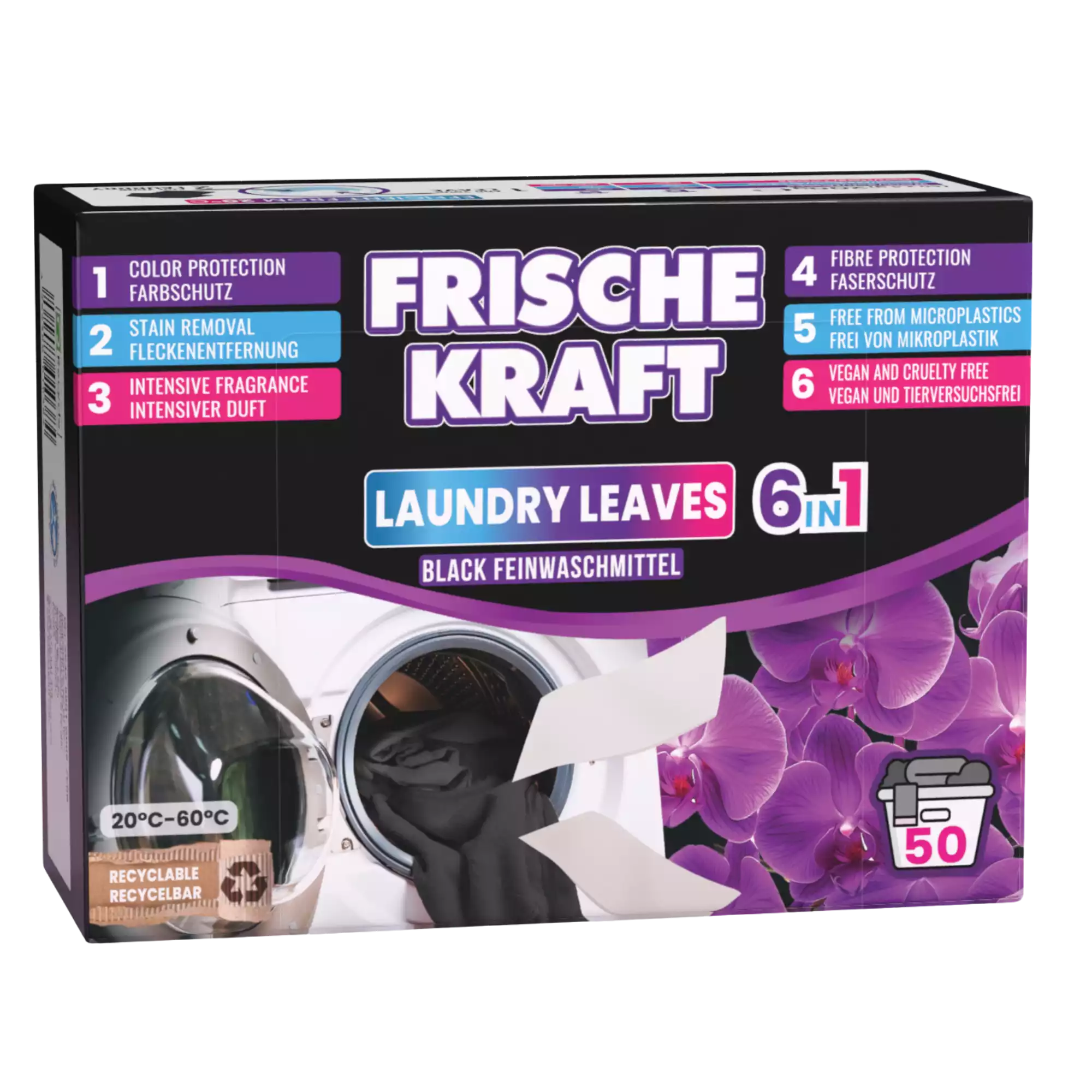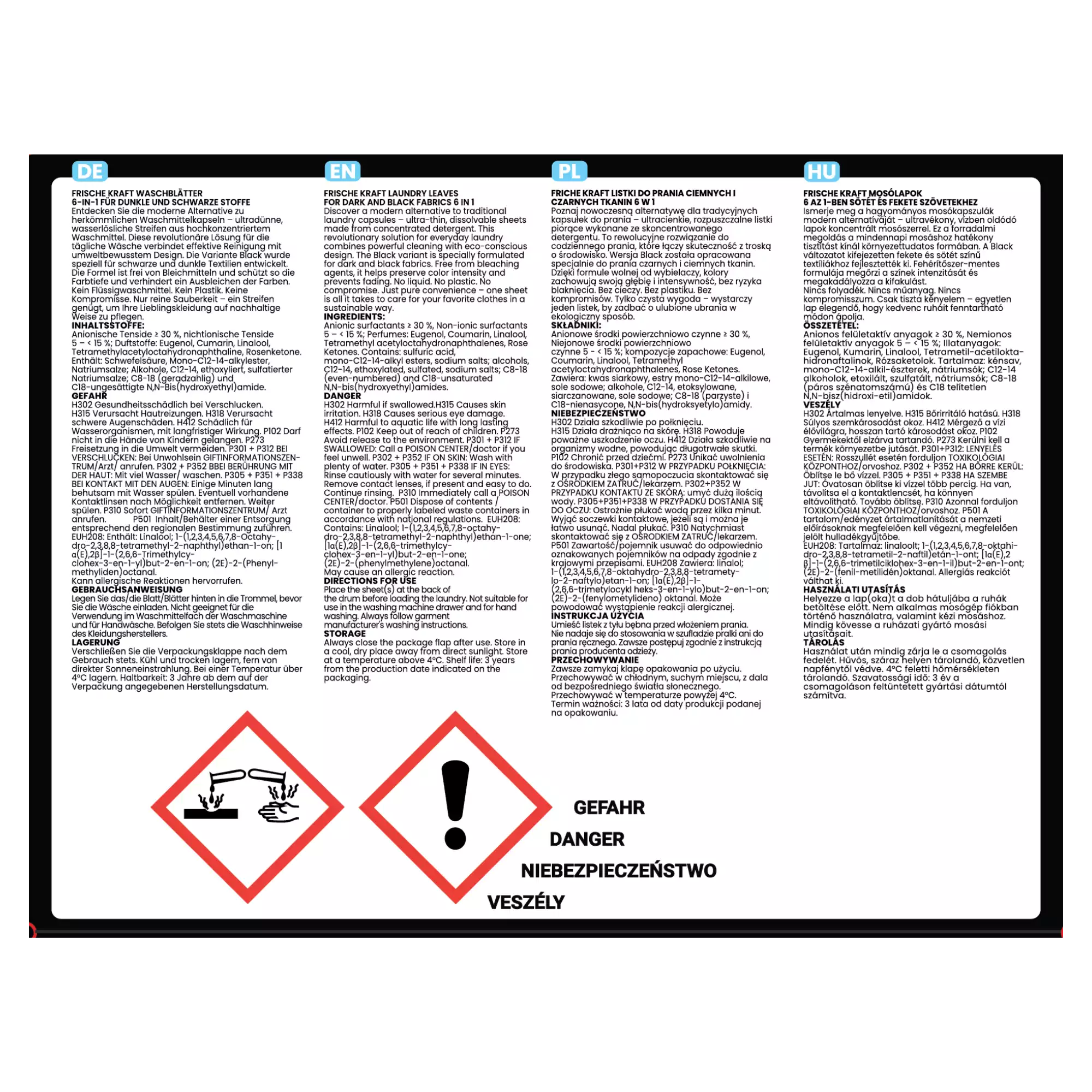 Frische Kraft 6w1 Black skalbimo lapeliai (50 vnt.) – modernus ir patogus sprendimas, skirtas specialiai juodiems ir tamsiems audiniams prižiūrėti. Inovatyvi 6-in-1 formulė ne tik veiksmingai šalina nešvarumus bei dėmes, bet ir padeda išlaikyti spalvų gylį bei intensyvumą, kad drabužiai ilgiau atrodytų kaip nauji.