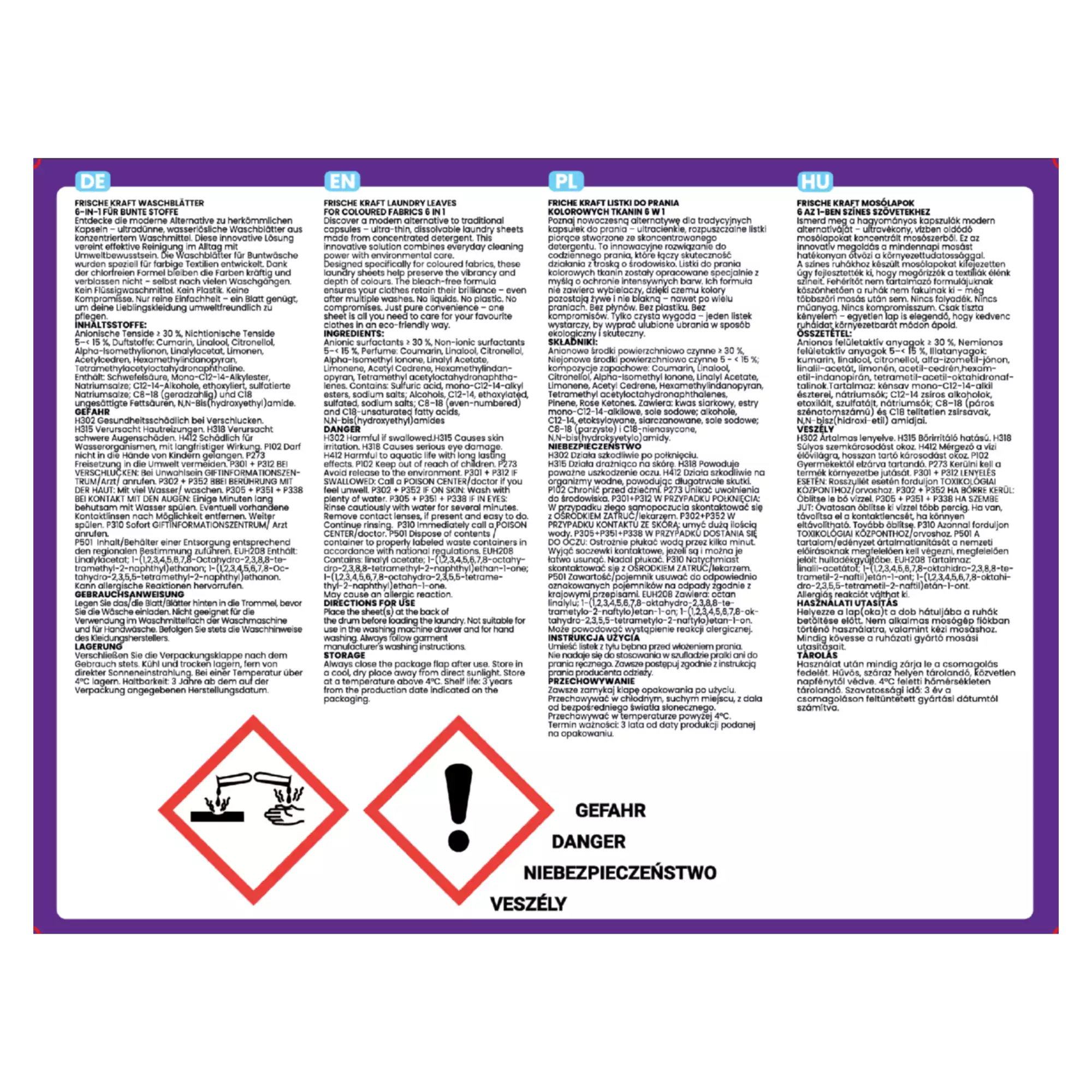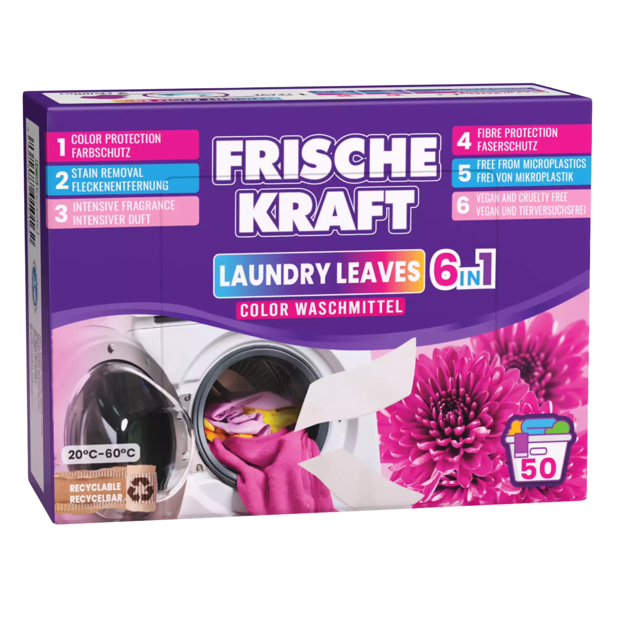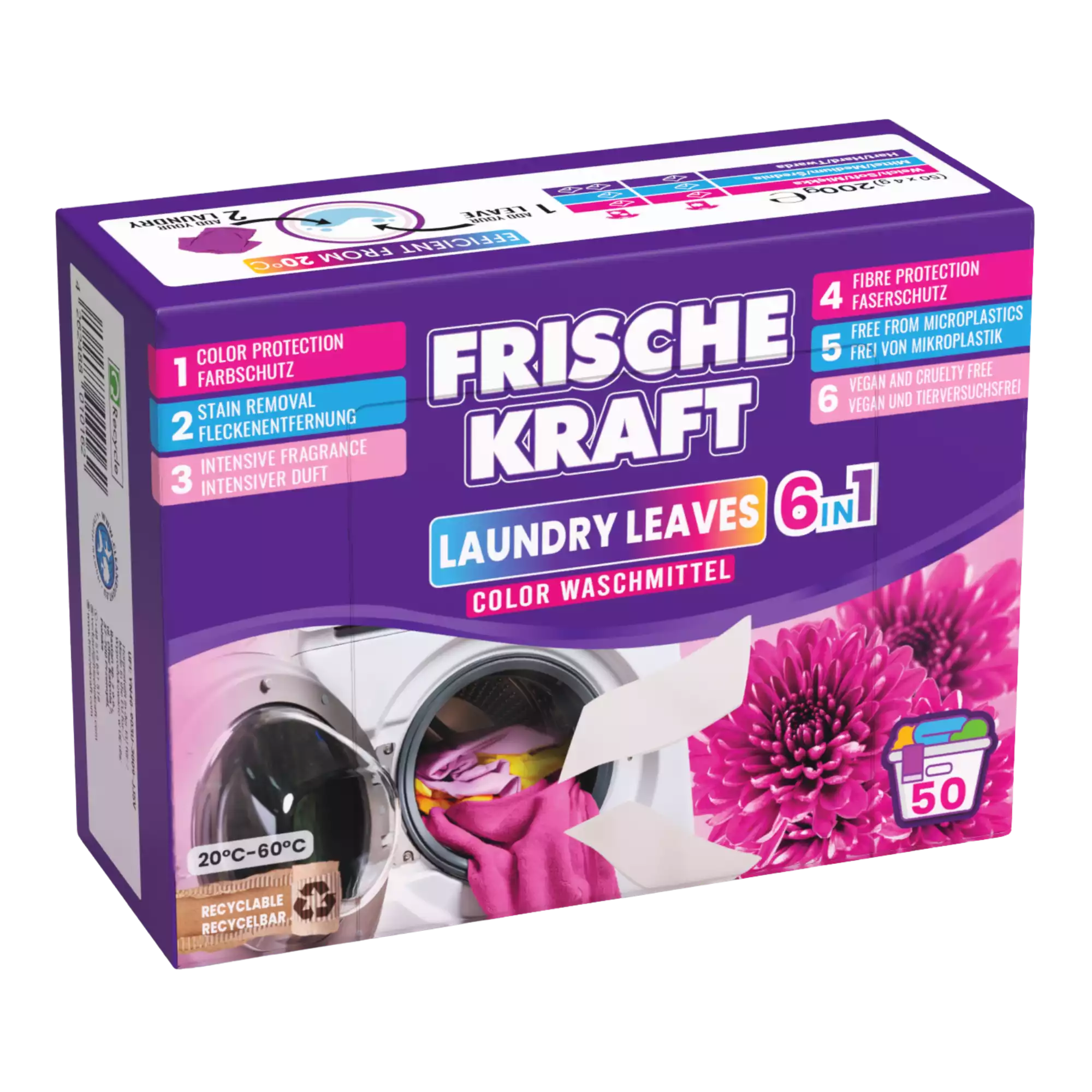 Frische Kraft 6w1 Color skalbimo lapeliai (50 vnt.) – modernus, kompaktiškas ir ekologiškas sprendimas spalvotų audinių priežiūrai. Naujos kartos formulė 6-in-1 ne tik efektyviai šalina dėmes ir nešvarumus, bet ir saugo spalvas nuo blukimo, išlaiko jų intensyvumą bei prižiūri audinių pluoštus.
