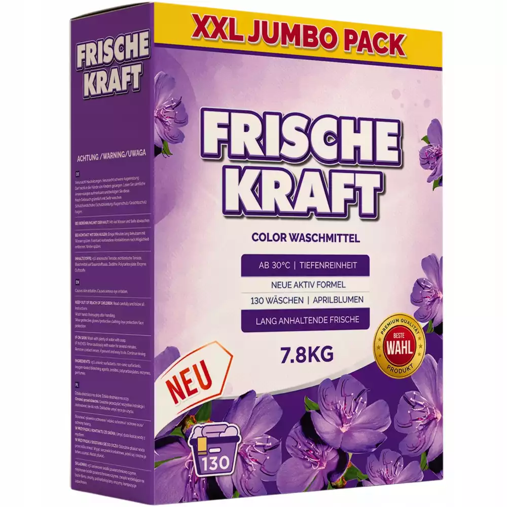 Frische Kraft Color skalbimo milteliai (7,8 kg / 130 skalbimų) – patikimas pasirinkimas, užtikrinantis nepriekaištingą švarą, ilgalaikę gaivą ir spalvų apsaugą.