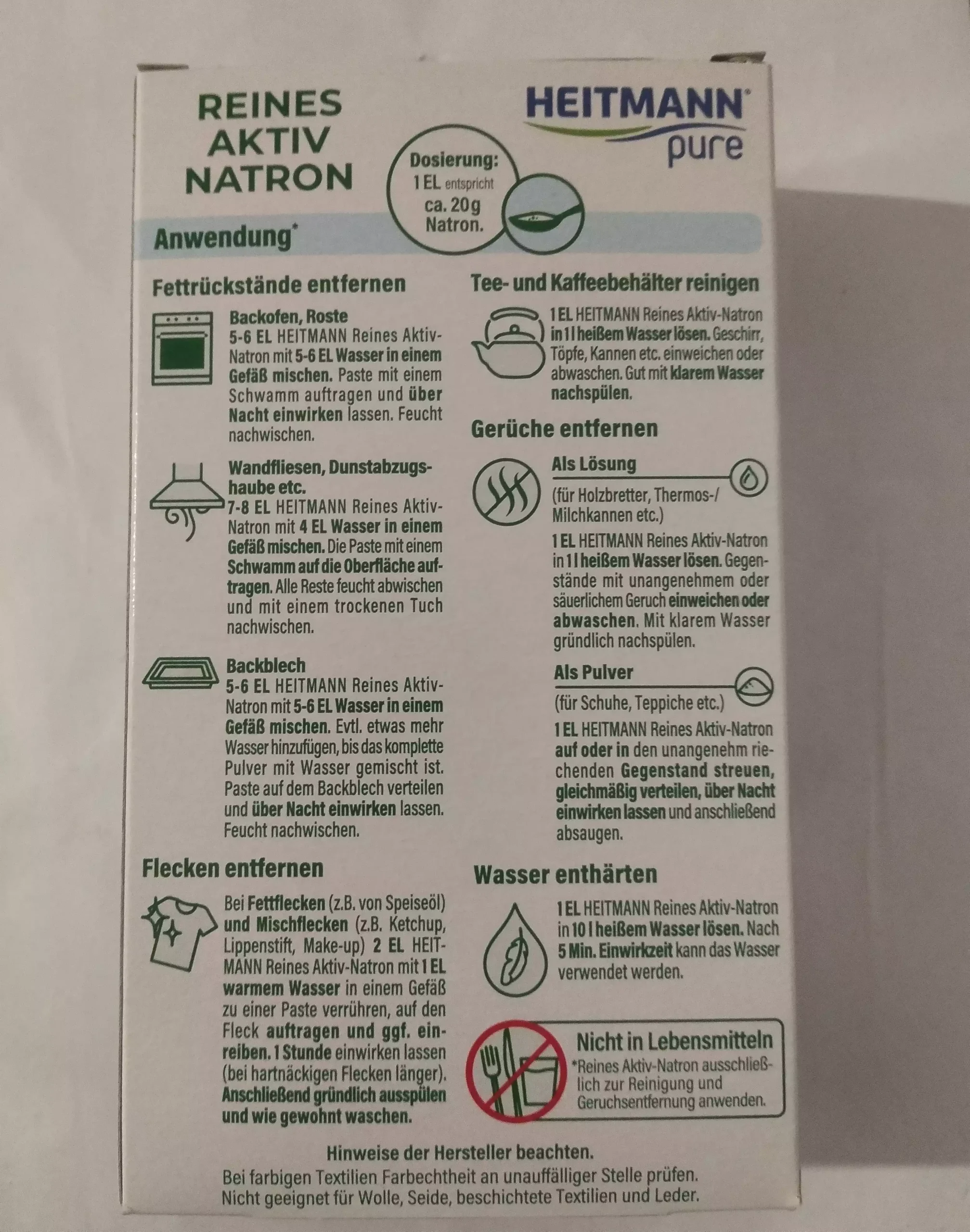 HEITMANN Pure Active Natron (450 g) – natūrali ir universali priemonė, padedanti palaikyti švarą namuose ir skalbiniuose. Tai vieno ingrediento produktas – natrio vandenilio karbonatas, žinomas dėl savo efektyvaus, bet švelnaus poveikio.