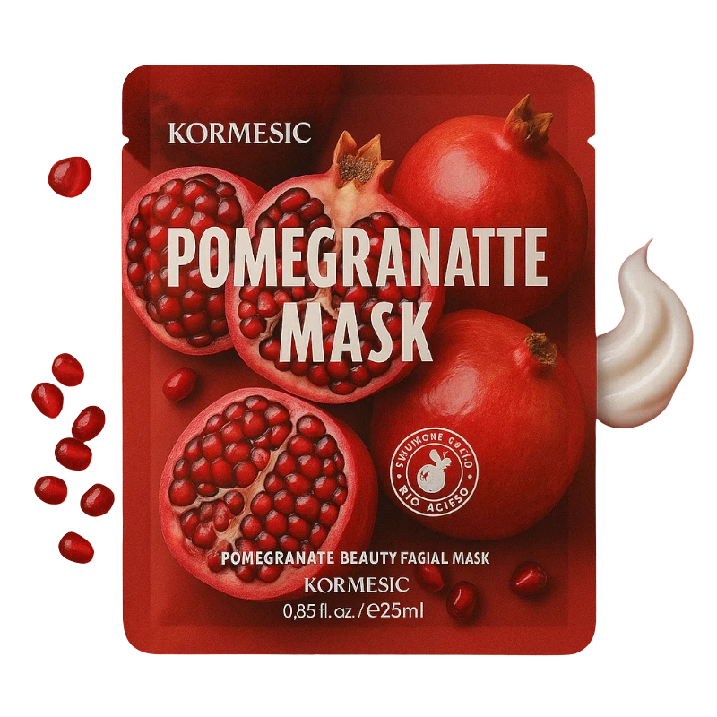 „Kormesic Pomegranate Radiance & Anti-Wrinkle Face Mask“ – veido kaukė, praturtinta natūraliu granatų ekstraktu, suteikianti odai galingą antioksidacinį poveikį. Ši kaukė padeda kovoti su papilkėjusia oda, mažina mimikos raukšlių požymius ir atkuria odos spindesį bei stangrumą.