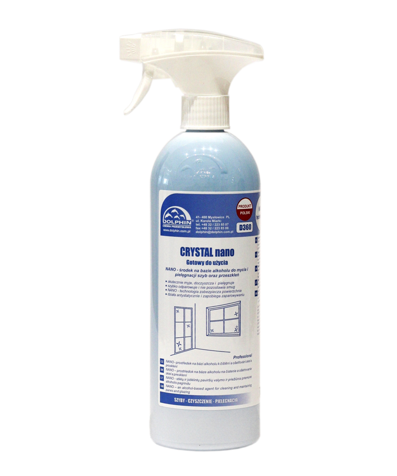 „Dolphin Crystal Nano“ langų ir stiklų valiklis – profesionali priemonė, skirta visų stiklinių, glazūruotų ir įstiklintų paviršių priežiūrai. Tinka stiklams, veidrodžiams, vitrinoms bei skaidriam plastikui valyti ir prižiūrėti.