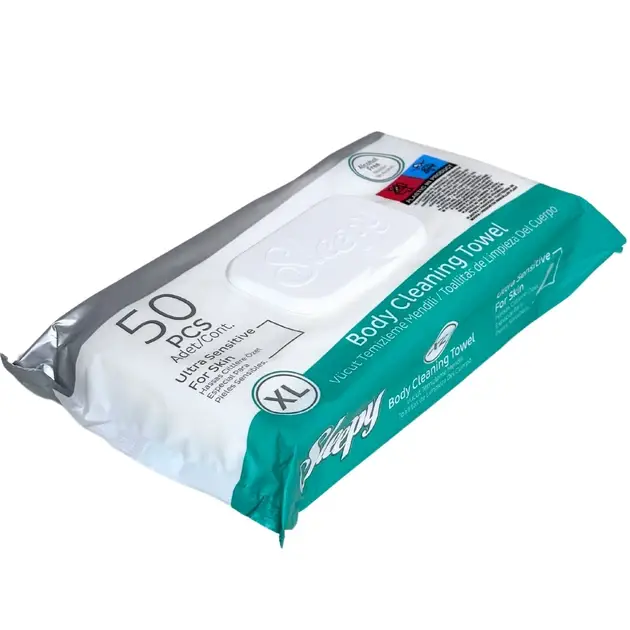 Sleepy XL drėgnos servetėlės kūno priežiūrai. Itin didelės, švelnios ir gaivinančios, su patogiu uždarymu. 50 vnt.