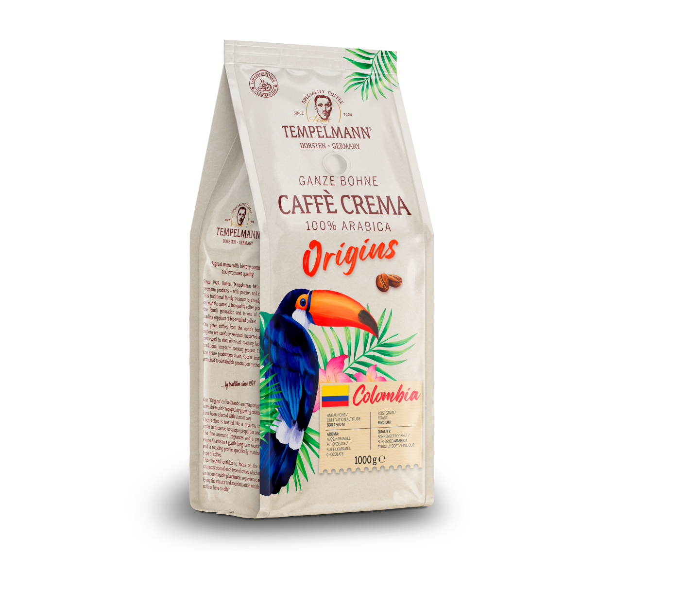 „Tempelmann Origins Colombia 100% Arabica Caffè Crema“ – tai aukščiausios kokybės kavos pupelės iš Kolumbijos aukštikalnių regionų, kur idealus klimatas ir dirvožemis suteikia kavai išskirtinį skonio balansą.